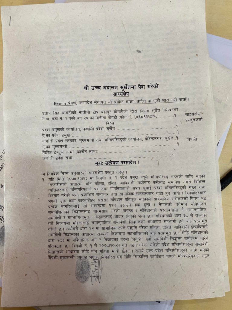 वीरेन्द्रनगरकी विनिता बोगटीले निर्वाचन ऐनविपरीत फौजदारी कसुरमा सजाय भोकेका व्यक्तिलाई मन्त्री बनाएको भन्दै सोमबार अदालतमा रिट दायर गरेकी हुन् ।