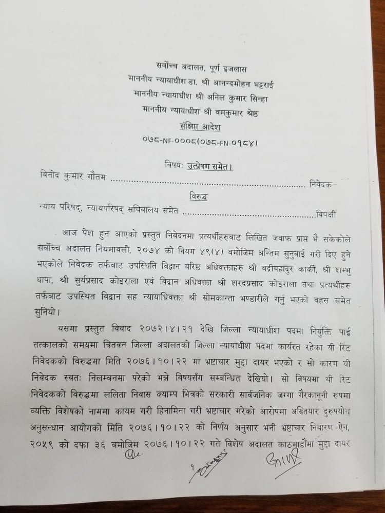 तर जब चितवन जिल्ला अदालतका न्यायाधीश विनोदकुमार गौतममाथि अख्तियारले तत्कालीन समयमा रहेका कर्मचारीका हैसियतले मुद्दा चलायो,त्यसपछि स्वतः पदमुक्त भएका न्यायाधीश गौतम आफूमाथि अन्याय भएको भन्दै सर्वोच्च अदालत पुगे ।