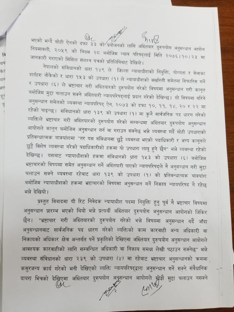 तर संविधानको धारा १५३ को उपधारा १ ले न्यायाधीशको बर्खास्ती समेतमा सिफारिस गर्ने र उपधारा ६ ले भ्रष्टाचार गरी अख्तियारको दुरुपयोग गरेको विषयमा अनुसन्धान गरी कानुन बमोजिम मुद्दा चलाउन सक्ने अख्तियारी न्यायपरिषद्लाई मात्रै दिएको छ । न्यायपरिषद् ऐन,२०७३ को दफा ११ मा ख