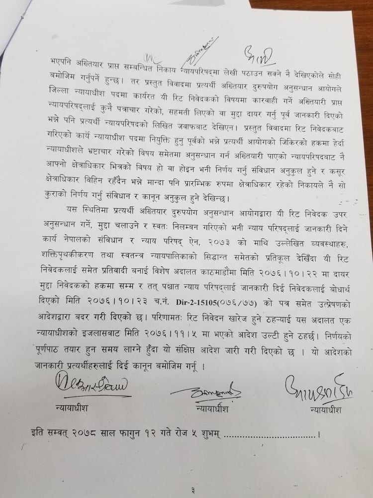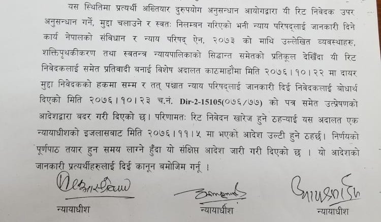 बिहीबार सर्वोच्च अदालतका न्यायाधीशत्रय आनन्दमोहन भट्टराई,अनिलकुमार सिन्हा र बमकुमार श्रेष्ठको पूर्ण इजलासले बहालवाला न्यायाधीशमाथि अनुसन्धान र अभियोजन गर्ने अधिकार अख्तियारलाई नभएको भन्दै न्यायाधीशमाथि लागेको भ्रष्टाचारको मुद्दा नै खारेज हुने फैसला गरेको हो ।