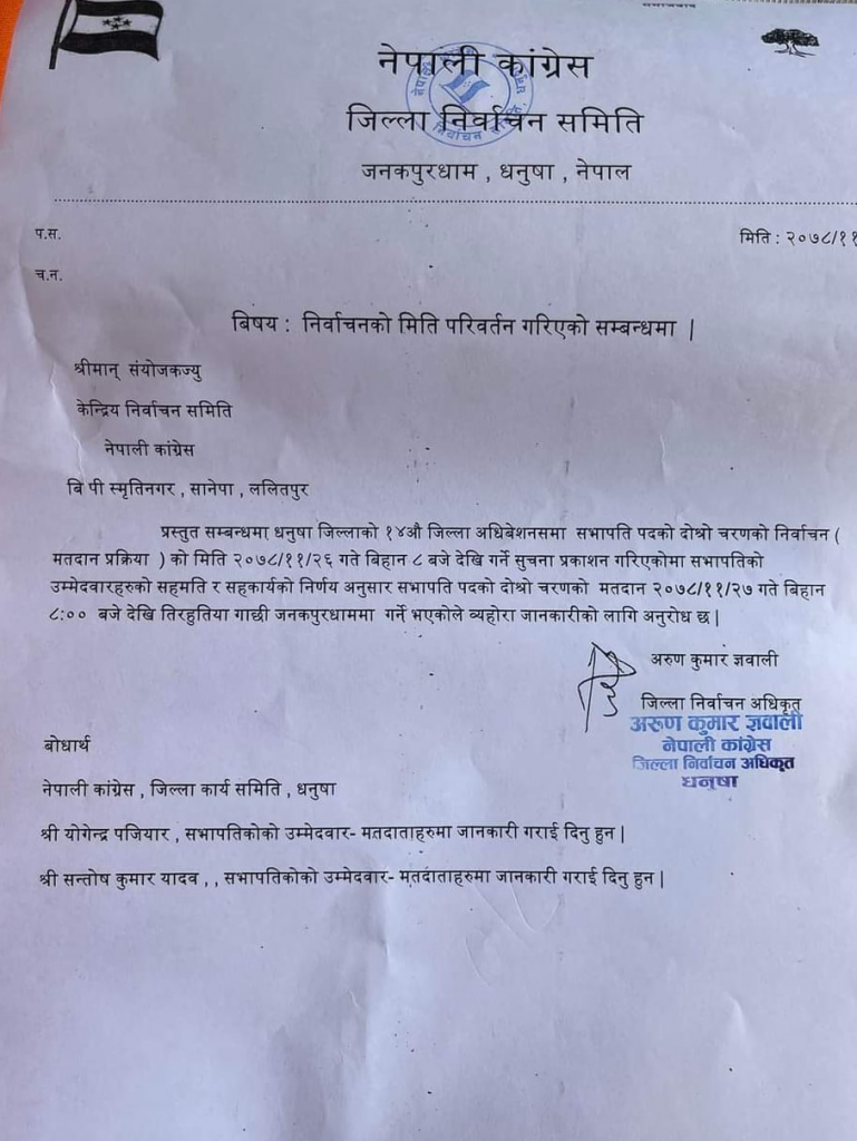 काँग्रेस धनुषाको सभापति पदको लागि दोस्रो चरणको निर्वाचन बिहीबार गर्ने भनिएको थियो । तर, शुक्रबार बिहान ८ बजेदेखि तिरहुतिया गाछीमा हुने काँग्रेस जिल्ला निर्वाचन अधिकृत अरुणकुमार ज्ञवालीले जानकारी दिए ।