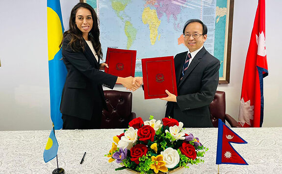 कूटनीतिक सम्बन्ध स्थापनासम्बन्धी संयुक्तपत्रमा संयुक्त राष्ट्रसङ्घका लागि नेपालका स्थायी प्रतिनिधि अमृतबहादुर राई र उक्त विश्व संस्थाका लागि गणतन्त्र पलाउका स्थायी प्रतिनिधि इलाना भिक्टोरिया सेडले न्यूयोर्कस्थित संयुक्त राष्ट्रसङ्घका लागि नेपालको स्थायी नियोगमा सोमबार आयोजित एक सङ्क्षिप्त समारोहमा हस्ताक्षर गरे ।