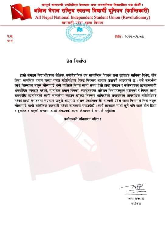 संगठनले आज एक प्रेस बिज्ञप्ति जारी गर्दै काभ्रे जिल्ला निवासी नकुल चौलागाईंले आफ्नो संगठन र कलेजका छात्राहरुमाथी अमर्यादित व्यवहार गरेको,मानसिक तनाब दिएको,म्यासेनजरमा अश्लील विषयबस्तुहरु पठाएको,र बिगत लामो समयदेखि छानबिनको लागि सम्पर्कमा ल्याउन खोज्दा निरन्तर भागिरहेको लगाएतका अपराधिक गतिविधि गरेको संगठनमा सप्रमाण उजुरी आएपछी निज नकुल चौलागाईंमाथी सांकेतिक कारवाही गरेको बिज्ञप्तिमा उल्लेख गरिएको छ।