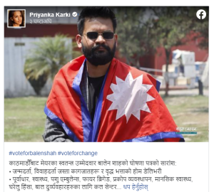 काठमाडौँ । अभिनेत्री प्रियंका कार्कीले स्थानीय तह निर्वाचनमा स्वतन्त्र उम्मेद्वारी दिएका बालेन शाहलाई भोट दिन आग्रह गरेकी छन् । सामाजिक सञ्जालमार्फत अभिनेत्री कार्कीले शाहलाई भोट दिन आग्रह गरेकी हुन् ।