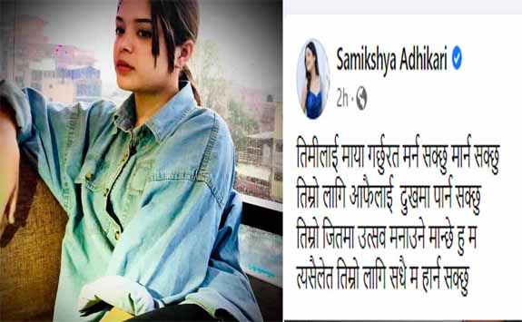 ‘तिमीलाई माया गर्छु रत मर्नसक्छु । मार्न सक्छु । तिम्रो लागि आफैंलाई दुःखमा पार्न सक्छु’ उनले अगाडि लेखेकी छन् ‘तिम्रो जितमा उत्सव मनाउने मान्छे हुँ म । त्यसैले त तिम्रो लागि सधै म हार्न सक्छु ।’ उनको यो पोष्टलाई लिएर सामाजिक सञ्जालमा विभिन्न टिप्पणी हुन थालेका छन् । उनले यो पोष्ट किन र केका लागि गरिन् भनेर बताएकी छैनन् ।