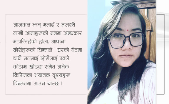 आजकल झन मलाई र मजस्तै लाखौँ आमाहरूको मनमा अन्धकार मडारिरहेको होला, आफ्ना छोरीहरूको चिन्ताले, आफ्ना छोराहरूको पनि चिन्ताले । घरको गेटमा चाबी नलगाई छोरीलाई एक्लै कोठामा छोड्दा समेत अनेक किसिमका भयानक दृश्यहरू चिन्तनमा आउन थाल्छ । स्कूलबाट घर नआउँदासम्म पनि मनमनै अनेकौँ चिन्ताहरूले मन सन्त्रस्त बनिरहन्छ । दिनभरको व्यस्त जीवनमा अभ्यस्त हुनैपर्ने, घर गएपछि छोरीलाई राम्ररी ननियाली मन सन्तोष हुनै मान्दैन आजकल । बलिष्ठ र कुरूप नङ्ग्रासहितको हातहरूको आकृतिले छोरीलाई घेरिरहेझैँ लाग्ने भयानक कल्पनाका दृश्यहरू मानसपटलमा घुमिरहन्छ । डर त्रास देखाई केही गर्छ कि, गर्यो कि ? भनी हरबखत चिन्ताले मन मस्तिष्क खाइरहन्छ । छोरीको सुनिश्चित भविष्यको चिन्ताले मन अशान्त भइरहन्छ ।