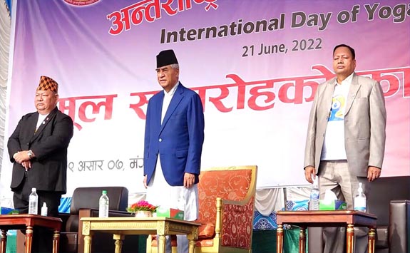 अन्तर्राष्ट्रिय योग दिवसका अवसरमा अन्तर्राष्ट्रिय योग दिवस मूल समारोह समितिले मंगलबार काठमाडौंमा आयोजना गरेको कार्यक्रममा प्रधानमन्त्री देउवाले तनावमुक्त शान्त मन, रोगमुक्त स्वस्थ्य शरीर, आघातमुक्त चित्त विकासमा योगको महत्वपूर्ण भूमिका रहेको बताए ।