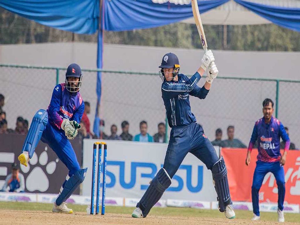 ज्ञानेन्द्र मल्लले २१, कुशल मल्ल १७, आशिफ शेखले १२, सन्दीप लामिछाने ९, सोमपाल कामी २, कुशल भुर्तेल १ रनमा आउट भए । स्कटल्यान्डका मार्क वाट्टले ३ र क्रिस ग्रिभ्सले २ तथा साफयान सरिफ, ब्रान्डन म्याकमुलन र माइकल लिस्क १-१ विकेट लिए ।