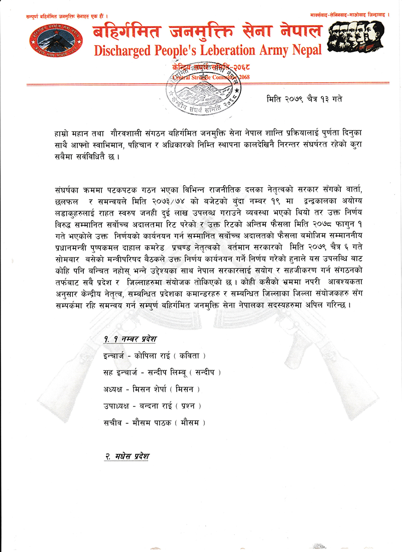 सरकारसँग सहजीकरण गर्न बहिर्गमित जनमुक्ती सेना नेपालले तोक्यो प्रदेश ईन्चार्ज र जिल्ला संयोजक हेर्नुुस् (पुर्णपाठ)