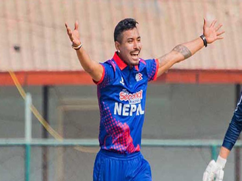 नेपालका सोमपाल कामीले यूएईका मुहम्मद वासिमको विकेट हात पारे ।