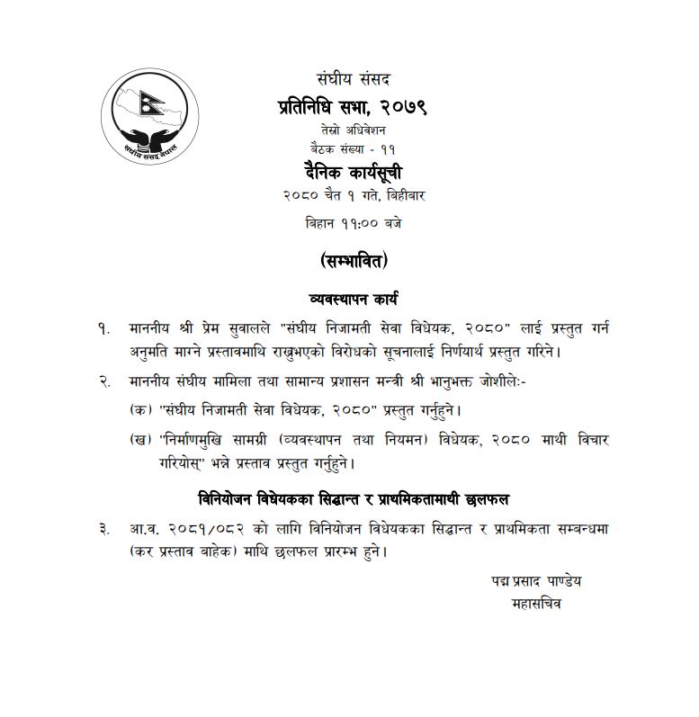 त्यसपछि संघीय मामिला तथा सामान्य प्रशासन मन्त्री भानुभक्त जोशीले ‘संघीय निजामती सेवा विधेयक २०८०’ प्रस्तुत गर्नेछन् ।
