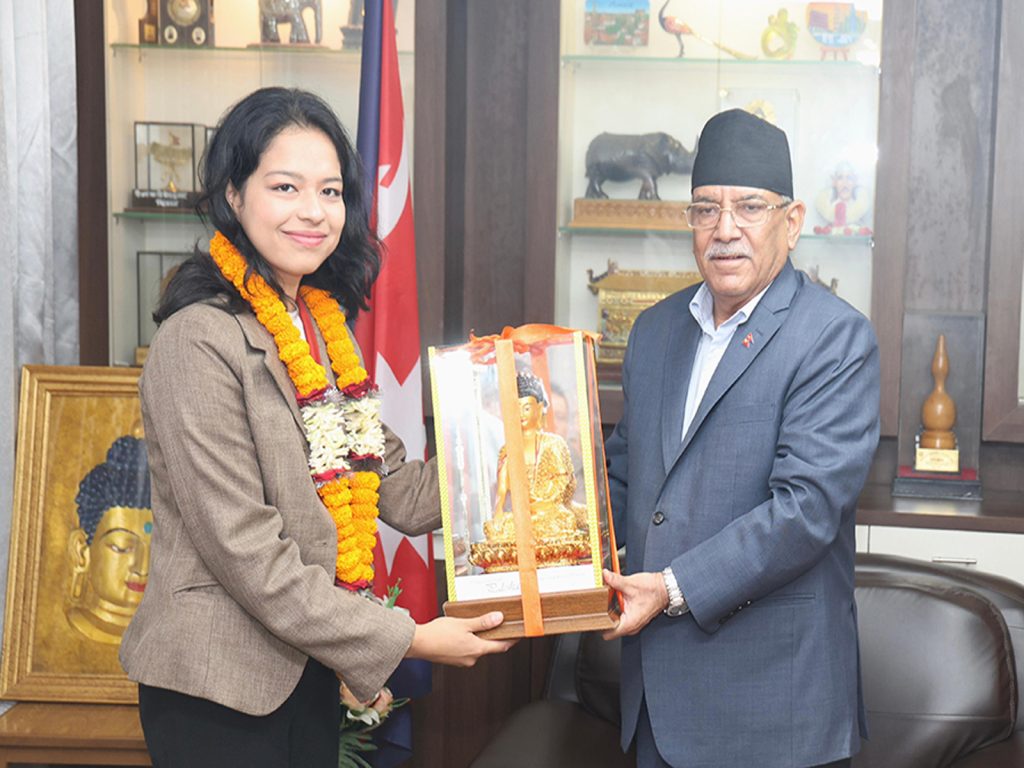 काठमाडौं । नेकपा माओवादी केन्द्रका अध्यक्ष पुष्पकमल दाहाल प्रचण्डले नेपालका लागि ओलम्पिकमा पहिलोपटक पदक प्राप्त गर्न सफल पलेशा गोवर्धनलाई आफ्नै निवासमा सम्मान गरेका छन् । खुमलटारस्थित निवासमा प्रचण्डले पलेशालाई बुद्ध मूर्ति उपहार दिँदै सम्मान गरे ।
